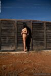 Livia, stunning brunette with long black hair, starts in sheer white lace lingerie and garters, adjusting her skimpy panties over her slim hips and long legs in high clear heels. She quickly goes fully nude, showcasing her massive heaving boobs with shiny pierced nipples and navel piercing, tattoos snaking across her arms, chest, and torso. Side profiles highlight her huge natural tits and tight ass against the wooden fence. Leaning seductively on the wall, hands gripping wood, arms outstretched, eyes closed in ecstasy, she teases with a white bra or cloth barely covering her pierced nips and shaved pussy, pure outdoor nudity stripping fantasy.
