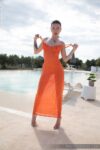 Lyleen, the lean tattooed brunette, kicks off her gallery stripping naked by the pool. Starts hands on knees in the water, tattooed body glistening. Sits pool edge, arches back to flaunt firm buttocks and lower back ink. Lies supine, arms crossed over perky tits, then stands turning to show Playboy tramp stamp. Drapes orange fabric teasingly over shoulders and waist in beige high heels, no bra no panties. Pulls bikini bottoms to thighs, exposing shaved pussy and tight ass. Transitions to sheer orange dress, hands squeezing chest, legs spread. Removes bikini top, bares back and butt, holds dress straps with spider chest tattoo visible. Pure solo tease, all nude reveal progression.