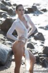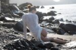 Nadia, the slim brunette with fair skin and high bun, starts back-turned nude facing the ocean, wet skin glistening, lower back tattoo visible. She reclines on rocks, arms up, legs parted exposing vulva. Kneeling, water drips from her naked body as she holds white cloth overhead. Teasingly covers tits and shaved pussy, then drapes sheer fabric around waist, arms raised baring perky medium breasts. Sits in wet white dress hiking up bare ass cheeks. Kneels nude with shirt tied at waist, water splashing. Drapes sheer long-sleeve shirt over shoulders, nude below, hand on hip framing her exposed cunt and tan lines.